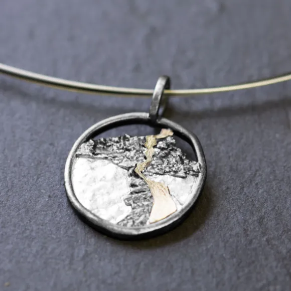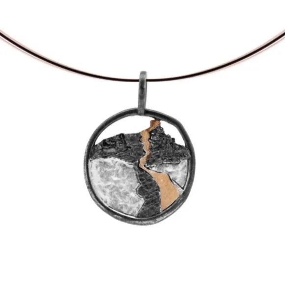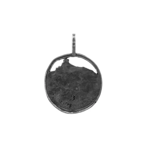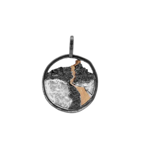 Colgante redondo de Plata de 1ª Ley (925mm) con textura que representa San Juan de Gaztelugatxe. Contiene una lamina en oro de 18kt. (750mm) simulando las escaleras que atraviesan la roca para llegar hasta la ermita ubicada en la cima. Diámetro del colgantes: 20mm. Medida de la reasa: 6mm de diámetro. Cable no incluido.