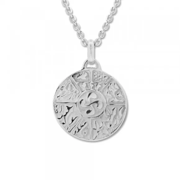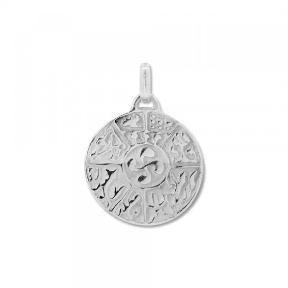 Colgante redondo de Plata de 1ª Ley (925mm), trabajado en ambas caras, que rinde homenaje a la tradición e identidad vasca. En una de sus caras destaca el Lauburu en relieve con acabado pulido que contrasta con el fondo texturizado. En la cara opuesta, el colgante muestra el lauburu en la parte central rodeado por los escudos de las 7 provincias vascas, distribuida de forma equilibrada en segmentos radiales. El relieve y el fondo mate realzan cada detalle heráldico, creando un diseño armónico y lleno de significado. Diámetro colgante: 21mm. Medida reasa: alto 7mm y ancho 4mm.