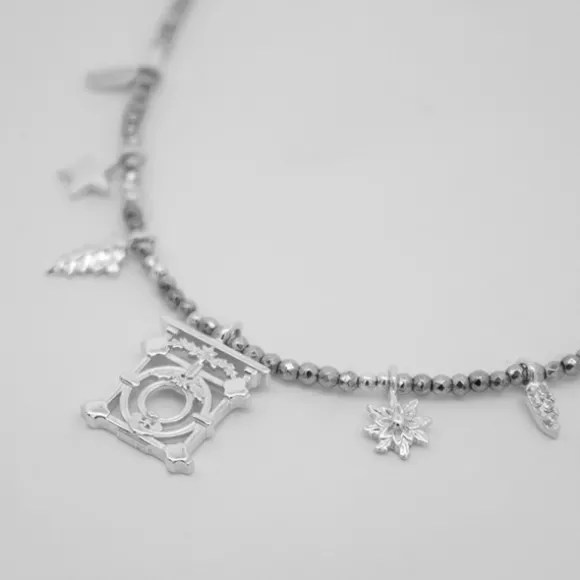 Gargantilla barandilla de la Concha de Donostia – San Sebastián en Plata de 1ª Ley (925mm) bañada en oro amarillo de 18 kt. (750mm) con collar de hematites de rutenio y plateados y con 6 diferentes motivos. Cierre de Langosta de Plata 1ª Ley (925mm). Largura del collar: 40 cm (+5cm de alargador). Medida Barandilla: alto 16mm y ancho 14mm. Diámetro hematites: 2mm. Diámetro de los motivos: 5mm.