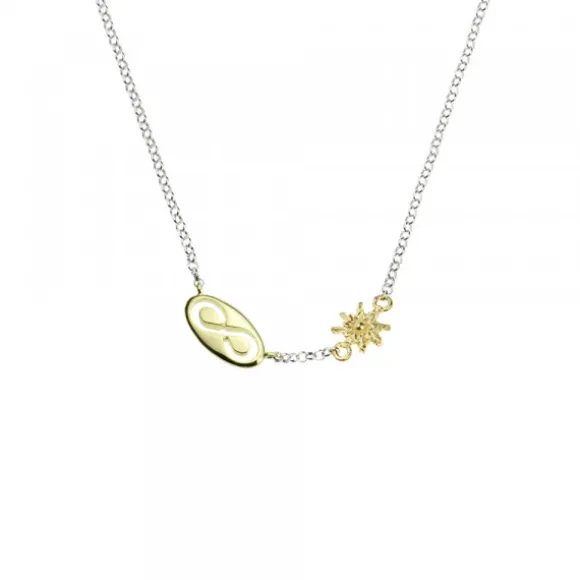 Gargantilla Infinito de Plata de 1ª Ley (925mm) con Infinito de Chapa Calada y motivo Eguzkilore de plata bicolor. La cadena es de tipo Rolo. Medida de la gargantilla: 45cm (Tres posiciones: 40,5cm, 43cm y 45cm). En caso de querer la gargantilla de plata es necesario pedir por encargo y se entregará en un plazo de 2-3 semanas.