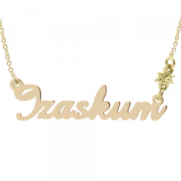 Gargantilla de Oro reciclado (750mm-18kt.) personalizada con el nombre «Izaskun» y motivo Eguzkilore en el lateral derecho. Largura de la cadena: 43cm aproximadamente. Cierre reasa. Diametro del motivo eguzkilore:. 4mm. Dimensiones del nombre: 38mm de ancho y 8mm de alto.
