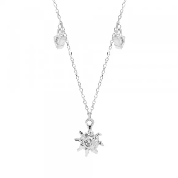 Gargantilla de Oro blanco reciclado (750mm-18kt.) Contiene 5 piezas de oro blanco a lo largo de la cadena. Una pieza central con motivo Eguzkilore cubierto por un brillante de 0,008kt. Cuatro piezas con forma de triángulo cubierto por 4 brillantes de 0,06kt. en los laterales. Diámetro de las piezas triangulares: 2mm. Medida de la cadena: 45cm (42cm + 3cm alargador).