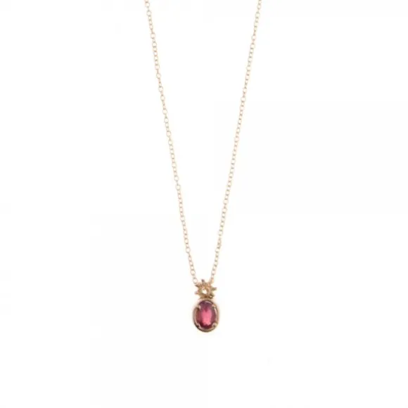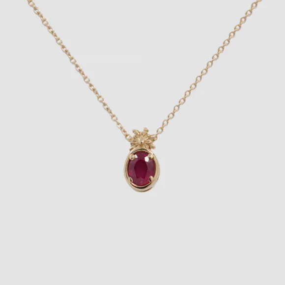 Gargantilla de cadena de Oro Rosa reciclado (750mm – 18kt.) con colgante con rubí engarzado y motivo Eguzkilore en la parte de arriba de la colección Enea de Eguzkilore. Medidas de la esmeralda: Ancho 3mm y Alto 4mm. Medidas de la cadena: 38cm + 4cm de alargador.