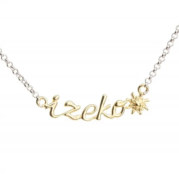 Gargantilla de Plata de 1ª Ley (925mm). Contiene la palabra «izeko» junto a motivo Eguzkilore de plata dorada. La cadena es de tipo Rolo. Tres modelos: Gargantilla bicolor, gargantilla plata o gargantilla plata dorada. (Seleccionar en desplegable).