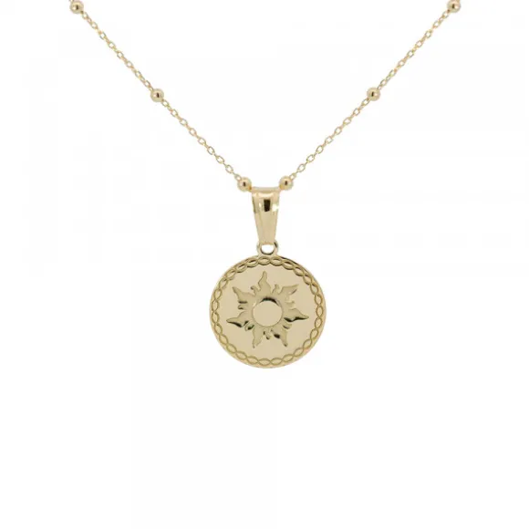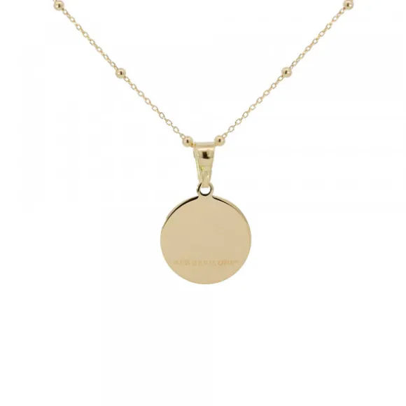 Gargantilla Mountain de Plata de 1ª Ley (925mm) bañada en oro de 18kt. con motivo redondo con grafilado en el borde y Eguzkilore grabado en el centro. Cadena tipo rolo con bolitas. Largura gargantilla: 42cm + 3cm de alargador . Diámetro motivo: 14mm.