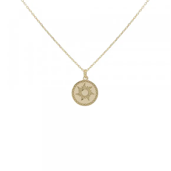 Gargantilla Mountain mini de Plata de 1ª Ley (925mm) bañado en oro 18kt. con motivo redondo con grafilado en el borde y Eguzkilore grabado en el centro. Cadena tipo rolo. Largura gargantilla: 50cm. Diámetro motivo: 10mm.