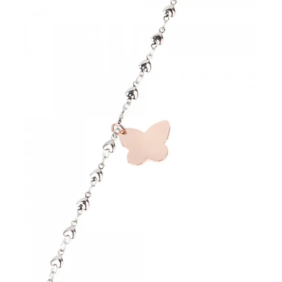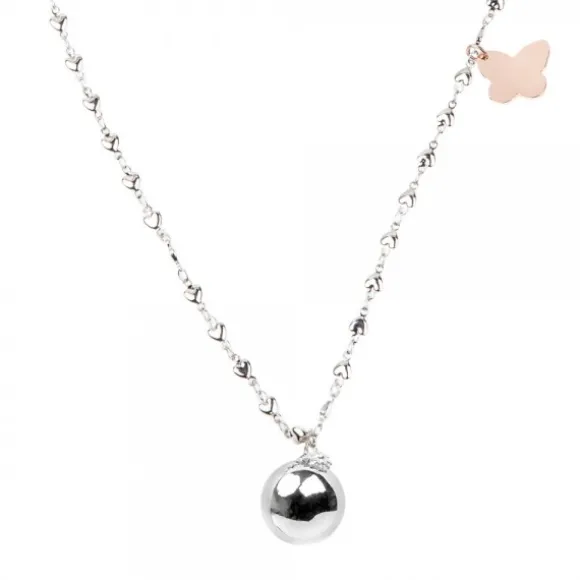 Llamador de Ángeles de latón y bronce cubierto por un baño de rodio con bola musical y motivo Eguzkilore de Plata de 1ª Ley (925mm). La cadena es larga de acero inoxidable tipo Forza con forma de corazones intercaladas a lo largo de ella y pieza con forma de Mariposa en Plata de Ley bañado en oro rosa de 18kt. que puede grabar un nombre o fecha de nacimiento. Únicamente el Eguzkilore es de Plata de 1ª Ley (925mm). Medida de la cadena: 110cm. Diámetro de la Pieza Musical: 20mm. Diámetro del Eguzkilore: 6mm. Medidas de la Mariposa: Alto 14mm y Ancho 15mm. Diámetro de cada Corazón: 4mm.*Una vez realizada la grabación, no se admite devolución.