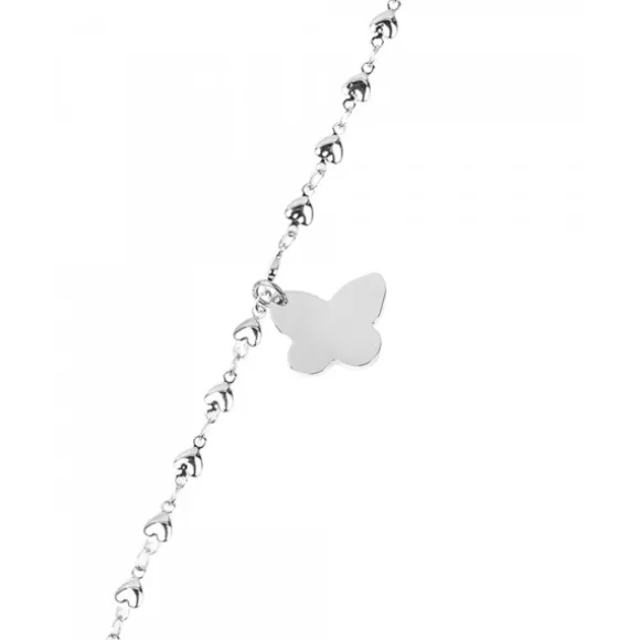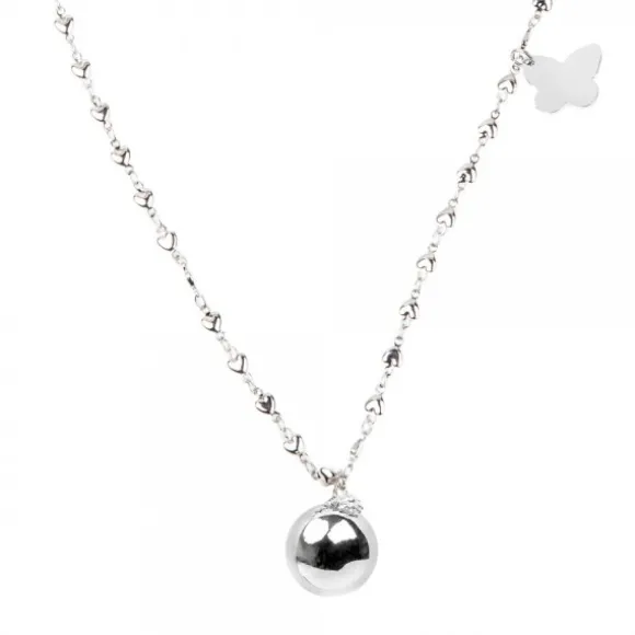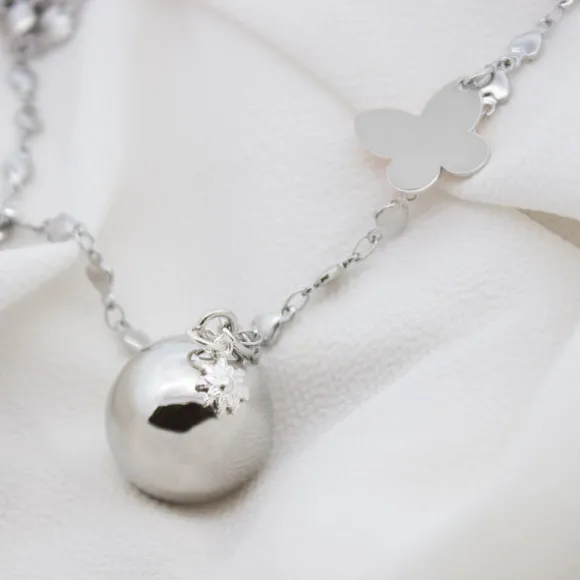 Llamador de Ángeles de latón y bronce cubierto por un baño de rodio con bola musical y motivo Eguzkilore de Plata de 1ª Ley (925mm). Incluye cadena larga de acero inoxidable tipo Forza con forma de corazones intercaladas a lo largo de ella y pieza con forma de Mariposa de Plata 1ª Ley (925mm) que puede grabar una inicial, nombre o fecha de nacimiento. Únicamente el Eguzkilore es de Plata de 1ª Ley (925mm). Medida de la cadena: 110cm. Diámetro de la Pieza Musical: 20mm. Diámetro del Eguzkilore: 6mm. Medidas de la Mariposa: alto 14mm y ancho: 15mm. Diámetro de cada Corazón: 4mm.*Una vez realizada la grabación, no se admite devolución.