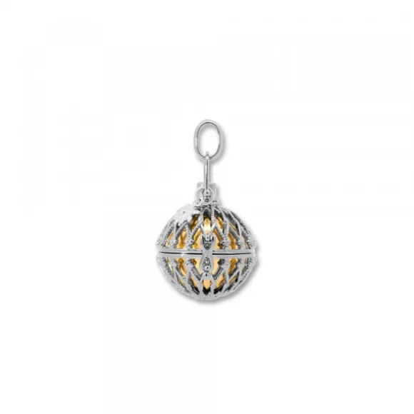 Llamador de Ángeles de Latón cubierto por un baño de rodio con colgante compuesto por rombos entrelazados y una pieza musical color dorado en su interior. Contiene motivo Eguzkilore de Plata de 1ª Ley (925mm). La cadena es larga de acero inoxidable tipo Forza con bolas intercaladas a lo largo de ella y mariposa dorada con posibilidad de personalizar con una inicial o número. Medida de la cadena: 110cm Diámetro llamador: 20mm. Diámetro del Eguzkilore: 6mm. Diámetro de la pieza redonda con sonido: 13mm. Diámetro de cada bola de la cadena: 3mm. Diámetro mariposa: alto 11mm. Únicamente el Eguzkilore es de Plata de 1ª Ley.* Una vez realizada la grabación, no se admite devolución.