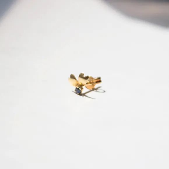 Pendiente mini trepador de Oro reciclado (750mm-18kt.) en forma de unión de dos corazones con circonita de color azul engarzada en el medio. Cierre de presión.*Edición Limitada disponible sólo en web.