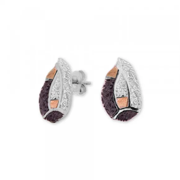 ¡Novedad! Pendientes con forma de la almendra de Vitoria-Gasteiz de Plata de 1ª Ley (925mm) bicolor plata y rutenio con diferentes acabados. Contiene dos lámina de Oro 18kt. (750mm) reciclado. Cierre presión. Medida: alto 16mm y ancho 10mm.