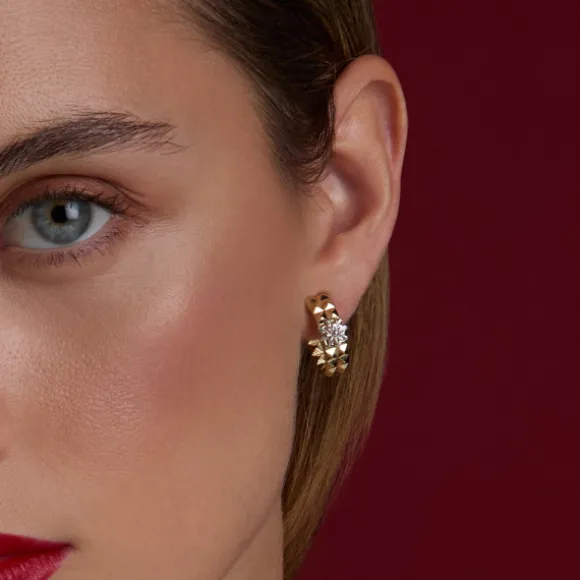 Pendientes Aiora con forma de medio aro de Plata de 1ª Ley (925mm) bañados en Oro 18kt. (750mm) reciclado, simulando tachuelas piramidales cuadradas. En la parte central contiene un Eguzkilore plata. Cierre presión. Medida Aro: alto 20mm y ancho 5mm. Diámetro Eguzkilore: 7mm.