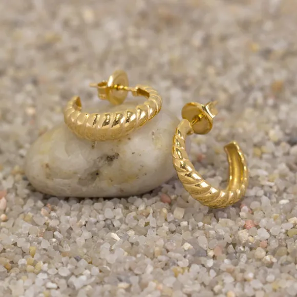 Pendientes con forma de aro gallonados de la colección Grecia en Plata de 1ª Ley (925mm) cubierto por baño de oro amarillo de 18kt. Cierre de presión. Medidas: alto 20mm y ancho 20mm.