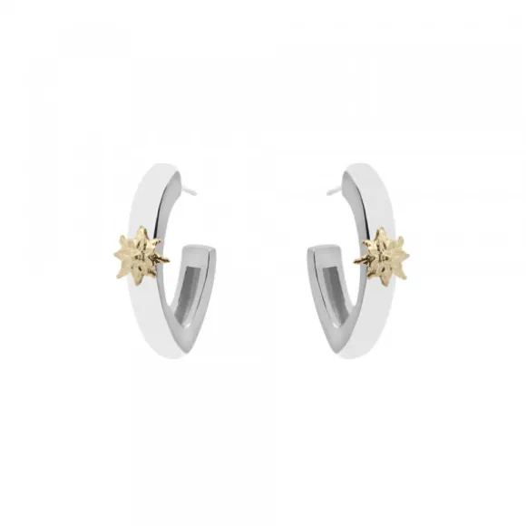 Pendientes de aro Olatu de Plata de 1ª Ley (925mm) de forma plana con motivo Eguzkilore de plata bañado en Oro 18kt. reciclado en el centro. Medidas del aro: 20mm de largo y 14mm de ancho.