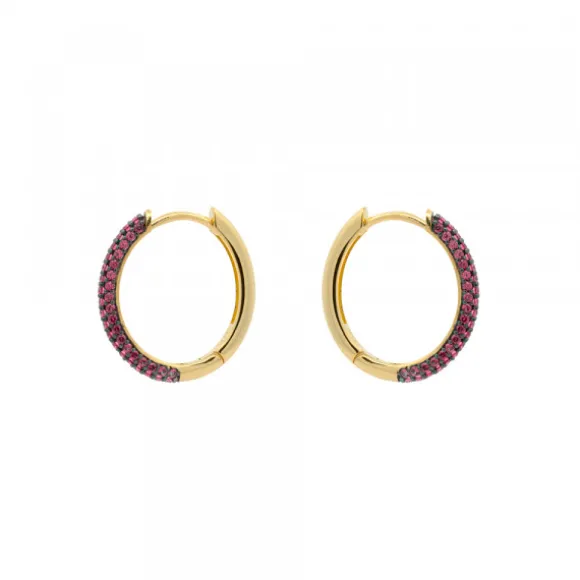 Pendientes de Aro de Plata de 1ª Ley (925mm) bañado en oro de 18kt. con circonitas rosas en la parte frontal. Cierre criolla. Diámetro del aro: 17mm.