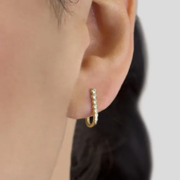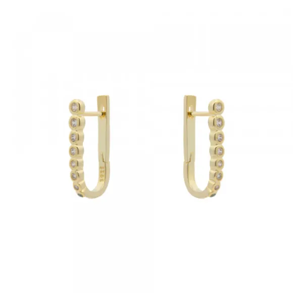 Pendientes de Aro de Plata de 1ª Ley (925mm) bañado en oro de 18kt. con forma de U y circonitas blancas en la parte delantera. Cierre clip. Medidas del aro: 18mm de largo y 10mm de ancho.