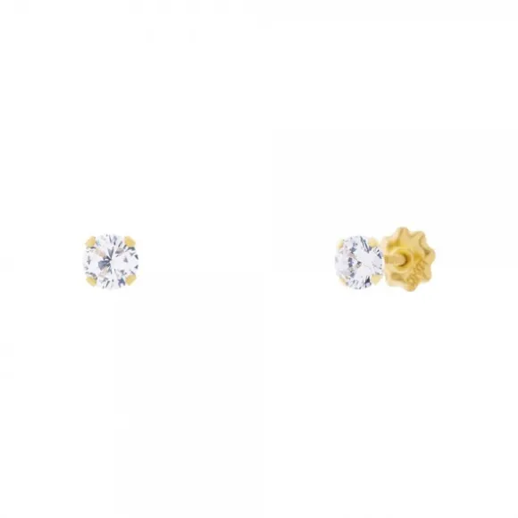 Pendientes infantiles Eguzkitxiki de Oro amarillo reciclado (750mm-18kt.). Contiene una circonita blanca en la parte central engarzada con 4 patas de Oro Amarillo. Cierre a rosca. Diámetro de la circonita: 3,5mm.