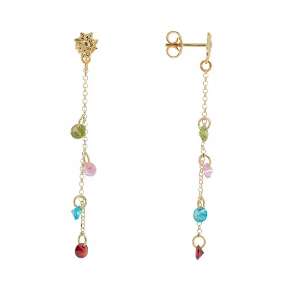 Pendientes largos Eguzkilore de Plata de 1ª Ley (925mm) bañados en oro 18kt. con motivo Eguzkilore en la parte superior y cadena y cristales multicolor colgando. Cierre de presión y cadena tipo rolo. Medida pendiente: alto 52mm. Diámetro Eguzkilore: 6mm. Diámetro cristales: 3mm.
