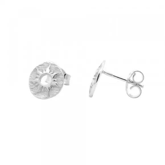 Pendientes Mountain de Plata de 1ª Ley (925mm) con acabado etrusco y motivo Eguzkilore en relieve en el centro de la pieza. Cierre presión. Diámetro pendientes: 9mm.