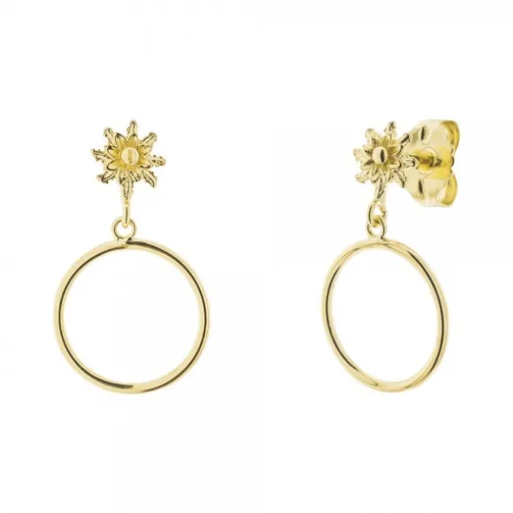 Pendientes Luna Llena largos de Plata de 1ª Ley (925mm) cubierta por un baño amarillo de 18kt. de dos piezas, una de plata dorada redonda simbolizando la «Luna Llena» y la otra en la parte superior con forma Eguzkilore. Cierre presión. Medidas del pendiente: Alto 25mm y Ancho 15mm. Diámetro del Eguzkilore: 7mm.