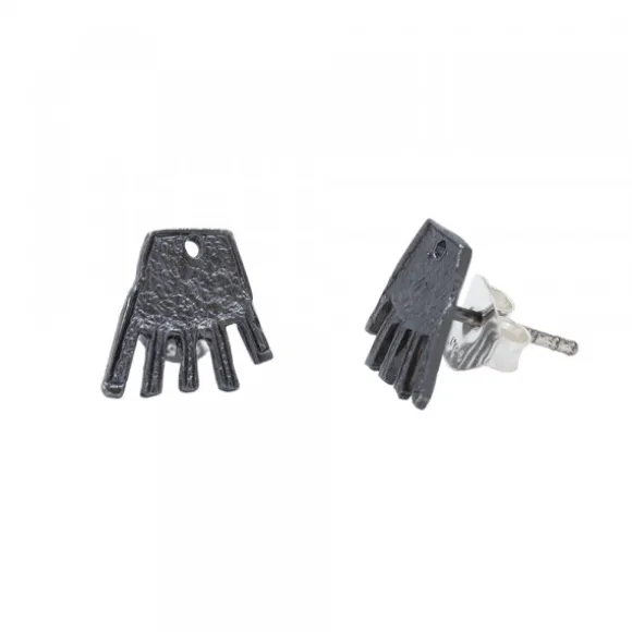 *Como colaboradores oficiales, una parte de los beneficios van destinados a las investigaciones de la Sociedad de Ciencias Aranzadi. Saber más en el siguiente enlace.Pendientes de plata de 1ª Ley (925mm) bañados en rutenio con forma de La Mano de Irulegi. Antiguamente era un objeto que se colgaba en la puerta de la entrada de la vivienda para proteger el hogar. Cierre Presión. Diámetro pendiente: 10mm.