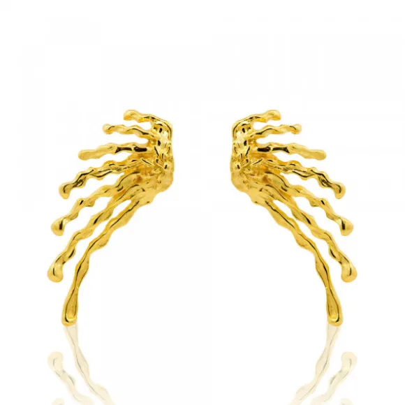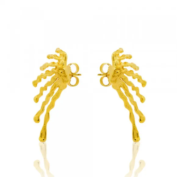 Pendientes maxi de Plata de 1ª Ley (925mm) bañado en oro 18kt. con Eguzkilore en la parte superior de la colección Ur. Sus formas irregulares y alargadas simulan gotas que se deslizan hacia abajo, como si la pieza estuviera derritiéndose poco a poco. Cierre presión. Medida: alto 47mm y ancho 24mm.