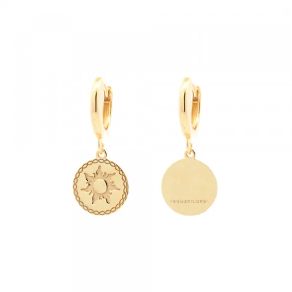 Pendientes largos con forma redondos de Plata de 1ª Ley (925mm) bañados en oro amarillo 18kt. con grafilado en el borde del pendiente y Eguzkilore grabado en el centro. Cierre de cripa. Medida pendiente: alto 23mm y ancho 8mm.