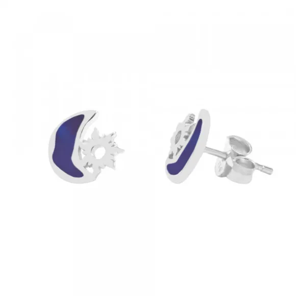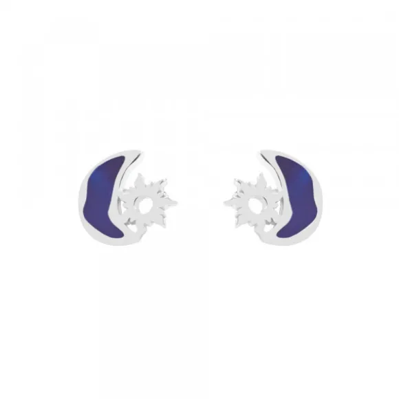 Pendientes de la colección Mountain de Plata de 1ª Ley (925mm) con motivo Luna esmaltado en azul y Eguzkilore. Cierre presión. Medida pendiente: alto 10mm y ancho 10mm.