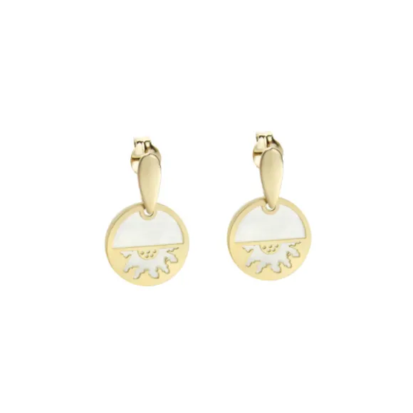 *No se admiten cambios ni devoluciones en artículos de Outlet.Pendientes de pala de Plata de 1ª Ley (925mm) bañados en Oro Amarillo de 18kt. y colgante redondo de nácar con motivo Eguzkilore. Medidas: Diámetro del pendiente: 20mm. Medida de la pala: 10mm de alto y 4mm de ancho.