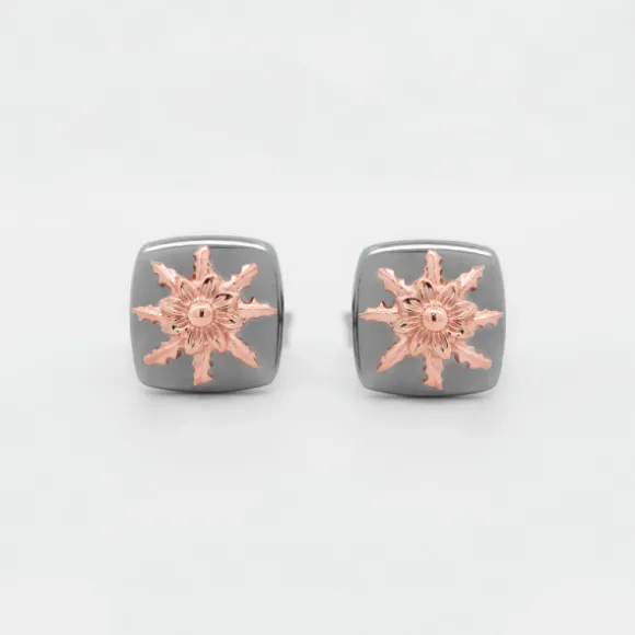 Pendientes de Plata de 1ª Ley (925mm) bañados en rutenio en forma cuadrada con motivo Eguzkilore en la parte central bañado en oro rosa de 18kt. Cierre presión. Diámetro del pendiente: 12mm. Diámetro del Eguzkilore: 10mm.
