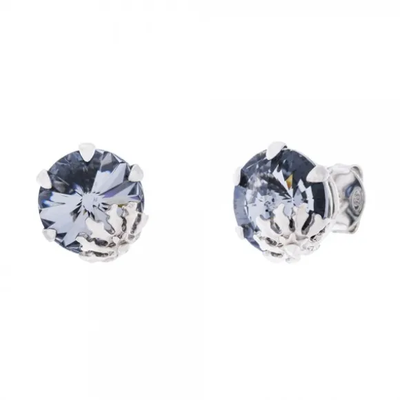 Pendientes Queen 3 de Plata de 1ª Ley (925mm) con un cristal azul cobalto redondo. El cristal está engarzado por 6 patas de plata y tiene motivo Eguzkilore en un lateral. Cierre presión. Diámetro del pendiente: 13mm.