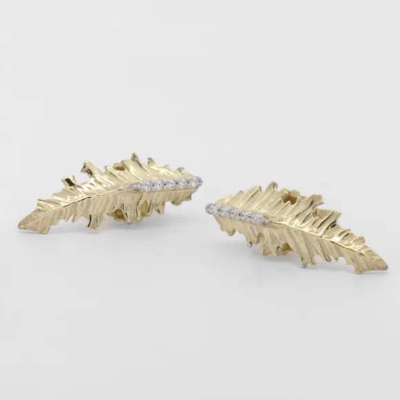 Pendientes trepador de Plata de 1ª Ley (925mm) bicolor con baño de Oro 18kt. (750mm) reciclado de la colección Mari. La pieza tiene forma de hoja del Eguzkilore adornada con circonitas blancas en carril. Cierre presión. Medida pendiente: alto 25mm y ancho 9mm.