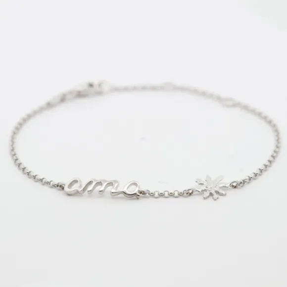 Pulsera en Plata de 1ª Ley (925mm). Contiene la palabra «Ama» junto a motivo Eguzkilore en plata. La cadena es de eslabones. Tu mejor opción para el Dia de la Madre o cualquier otro día para demostrarle lo mucho que la quieres. Medida de la pulsera: 20cm (Tres posiciones: 16,5cm, 18,5cm y 20cm). Medidas ama: Alto: 3mm. Ancho: 17mm. Diámetro del Eguzkilore: 7mm.