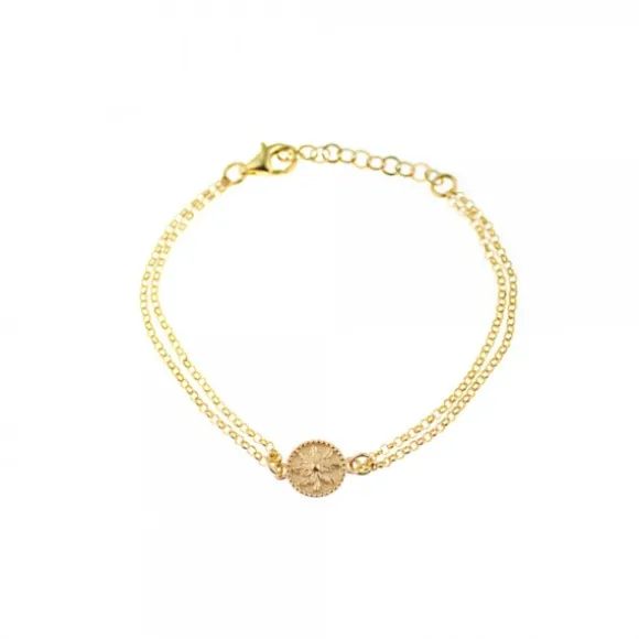 Pulsera con doble cadena de Plata de 1ª Ley (925mm) bañada en Oro Amarillo de 18kt. y pieza redonda con cerco perlado y motivo Eguzkilore en la parte central.