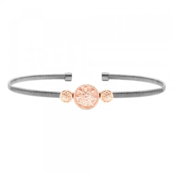 Pulsera Anuk de Plata de 1ª Ley (925mm) semi rígida con motivos en Plata de 1ª Ley (925mm) bañados en oro rosa de 18kt. en forma de Eguzkilore. La pieza central lleva cerco perlado. Medida de la pulsera: 6cm. Diámetro de los motivos: 5mm los pequeños y 10mm el grande. El grosor de la pulsera es de 2mm.
