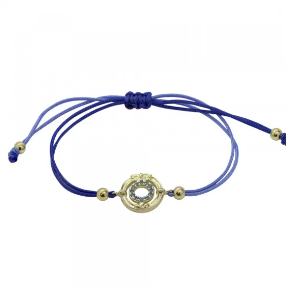 ¡Edición Limitada! Pulsera de hilo bicolor en tonos azules ajustable con motivo en forma de la Barandilla de la Concha de San Sebastián-Donostia en Plata de 1ª Ley (925mm) bañado en oro amarillo de 18kt. y cubierto por circonitas azules. Contiene bolitas de plata dorada decorativas en los terminales de la pulsera y a los laterales del motivo. Diámetro del motivo de la barandilla: 8mm. Diámetro de las bolitas: 4mm. Diámetro de las circonitas: 1mm.