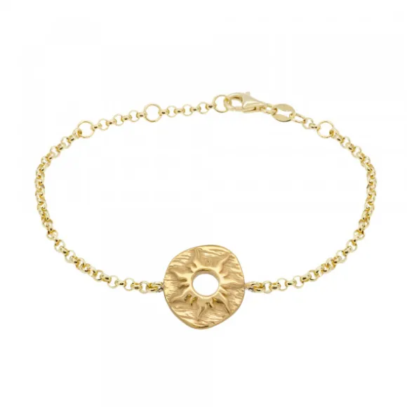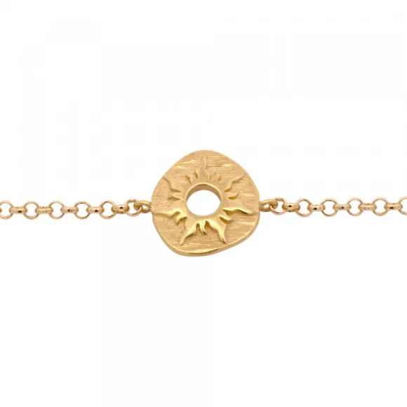 Pulsera chapa Mountain de Plata de 1ª Ley (925mm) bañado en oro 18kt. con acabado etrusco y motivo Eguzkilore en relieve en el centro de la pieza. cadena tipo rolo. Medida pulsera: 19,5cm (16,5cm + 3cm de alargador para ajustarlo a la medida deseada). Diámetro chapa:14mm.