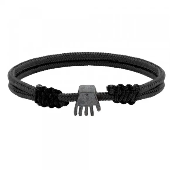 Pulsera de nylon negra con cuerdas corredizas negras y cierre macramé con charm de la mano de Irulegi de Plata de 1ª Ley (925mm) bañada en rutenio. Diámetro Charm: 10mm. Grosor de la pulsera: 2mm.