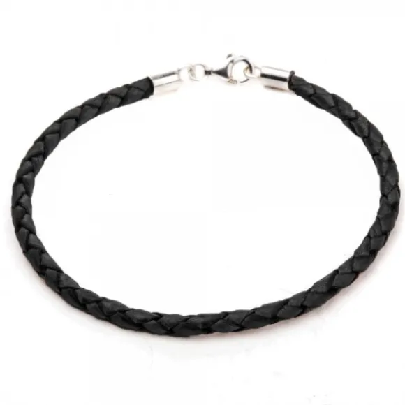 Pulsera de Cuero negro trenzado con terminales de Plata de 1ª Ley (925mm). Compatible con charms de Eguzkicharm y otras marcas. Grosor del cuero: 2mm.