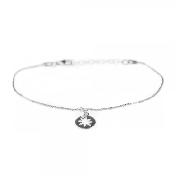 Pulsera de Plata de 1ª Ley (925mm) con cadena de cuatro caras. Contiene pieza de plata circular en la mitad de la cadena junto a otra pieza de plata circular con motivo Eguzkilore calado. Medida de la pulsera: 16,5cm + 3cm de alargador. Diámetro de la pieza circular central de la pulsera: 4mm. Diámetro de la pieza circular: 9mm. Diámetro del Eguzkilore: 6mm.