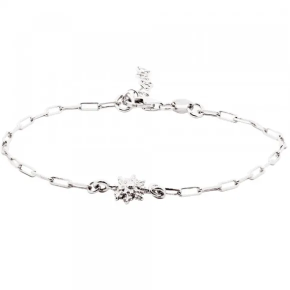 Pulsera de Plata de 1ª Ley (925mm) con Eguzkilore en el centro compuesto por cadena de eslabones alargados. Cierre langosta. Largura pulsera: 17cm + 3cm de alargados para ajustarlo a diferentes medidas. Diámetro Eguzkilore: 8mm. Medida eslabón: alto 2mm y ancho 5mm.
