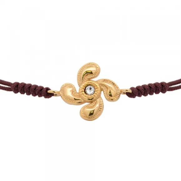 Pulsera macramé ajustable de hilo marrón con pieza central Lauburu de Plata de 1ªLey (925mm) bañada en oro 18kt.. Contiene circonita blanca en el centro y pespunte grafilado en los bordes de la pieza. Diámetro Lauburu: 13mm.