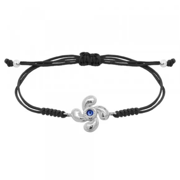 Pulsera macramé ajustable de hilo negro con pieza central Lauburu de Plata de 1ªLey (925mm). Contiene circonita azul en el centro y pespunte grafilado en los bordes de la pieza. Diámetro Lauburu: 13mm.