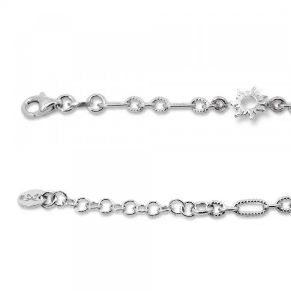 Pulsera Mountain de Plata de 1ª Ley (925mm) con 3 motivos Eguzkilore compuesta por cadena de eslabones alargados grafilados de diferentes medidas. Cierre langosta. Largura pulsera: 17,5cm + 3cm de alargador para ajustarlo a diferentes medidas. Diámetro Eguzkilore: 11mm.