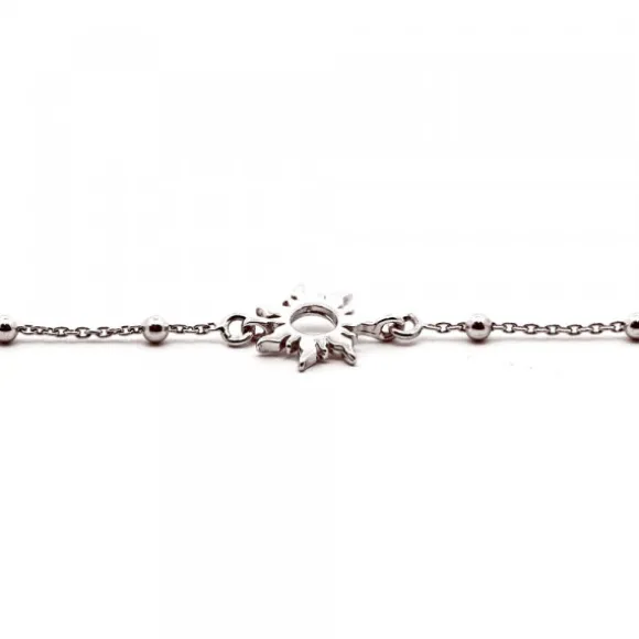Pulsera Mountain de Plata de 1ª Ley (925mm) con motivo Eguzkilore en el centro compuesto por cadena de eslabones tipo forza y bolitas intercaladas. Cierre langosta. Largura pulsera: 17cm + 3cm de alargados para ajustarlo a diferentes medidas. Diámetro Eguzkilore: 11mm. Medida bolita: 2mm.