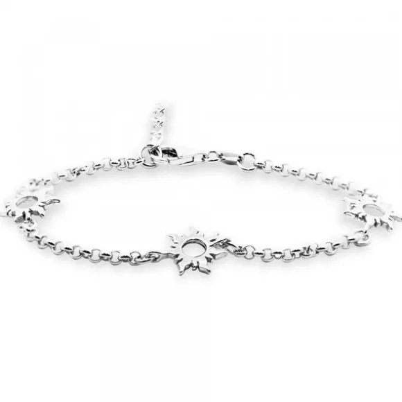 Pulsera Mountain de Plata de 1ª Ley (925mm) con 3 motivos Eguzkilore compuesto por cadena tipo forza. Cierre langosta. Largura pulsera: 17cm + 3cm de alargados para ajustarlo a diferentes medidas. Diámetro Eguzkilore: 11mm.