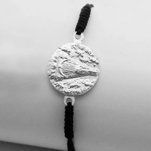 Pulsera Virgen de Begoña con forma redonda de Plata de 1ª Ley (925mm) de hilo negro con cierre de macramé para ajustarlo a diferentes medidas. En los extremos del motivo se encuentran nudos decorativos y bolita de Plata de 1ª Ley. Medida pulsera abierta: 23cm. Diámetro pieza: alto 17mm. Diámetro bolita: 4mm. Opción de personalizar con un nombre o fecha.*Una vez realizada la grabación, no se admite devolución.