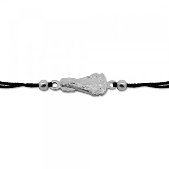 Pulsera con silueta de la Virgen de Begoña de Plata de 1ªLey (925mm) de hilo negro con cierre de macramé para ajustarlo a diferentes medidas. En los extremos del motivo se encuentran nudos decorativos y bolita de Plata de 1ª Ley. Medida pulsera abierta: 23cm. Medida motivo San Fermín: alto 17mm y ancho 9mm. Diámetro bolita: 4mm.