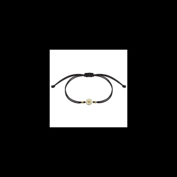 Pulsera de colección Zero de oro reciclado (750mm – 18kt.) con forma de circunferencia calada y motivo Eguzkilore en el centro de doble hilo en color negro. Cierre de macramé para ajustarlo a diferentes medidas. Contiene bolitas de oro de Ley decorativas en los laterales del motivo. Diámetro pieza central: 7mm. Diámetro Eguzkilore: 6mm.