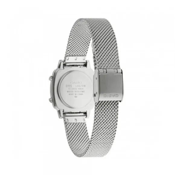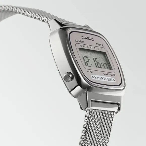 Reloj Casio modelo LA670WEM-7EF para mujer. Reloj original de la colección Casio Collecion. Un modelo digital con movimiento de cuarzo alimentado con pila. Incorpora cronógrafo, alarma multiple y calendario automático. La caja que contiene el mecanismo está fabricada en resina, tiene unas dimensiones de 24.6 milímetros de diámetro. La correa es de acero inoxidable PVD color plata tipo malla milanesa con cierre ajustable. Un cristal mineral resistente cuida a la esfera, la cual es de color plata con luz led y con letras blancas. Tiene una resistencia al agua de 30 metros por lo que soporta pequeñas salpicaduras de agua.